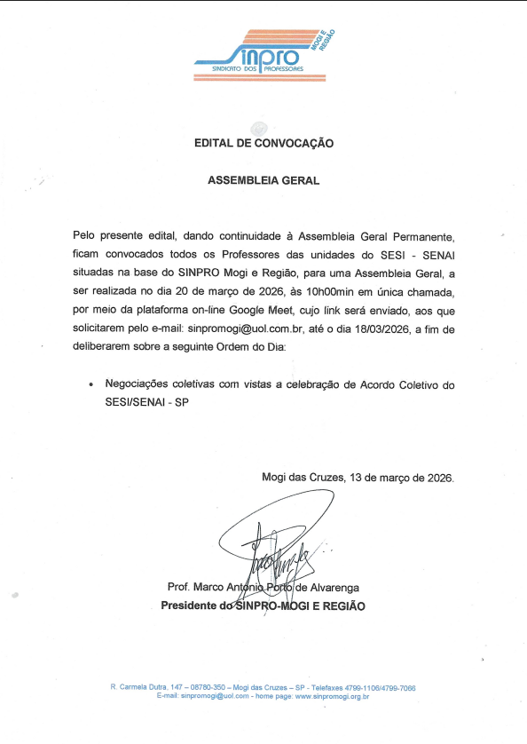 - 11/11/2025: Edital de Convocação - Assembleia Geral (Educação Básica e Tecnico, SESI-SENAI e Educação Superior) Leia mais...