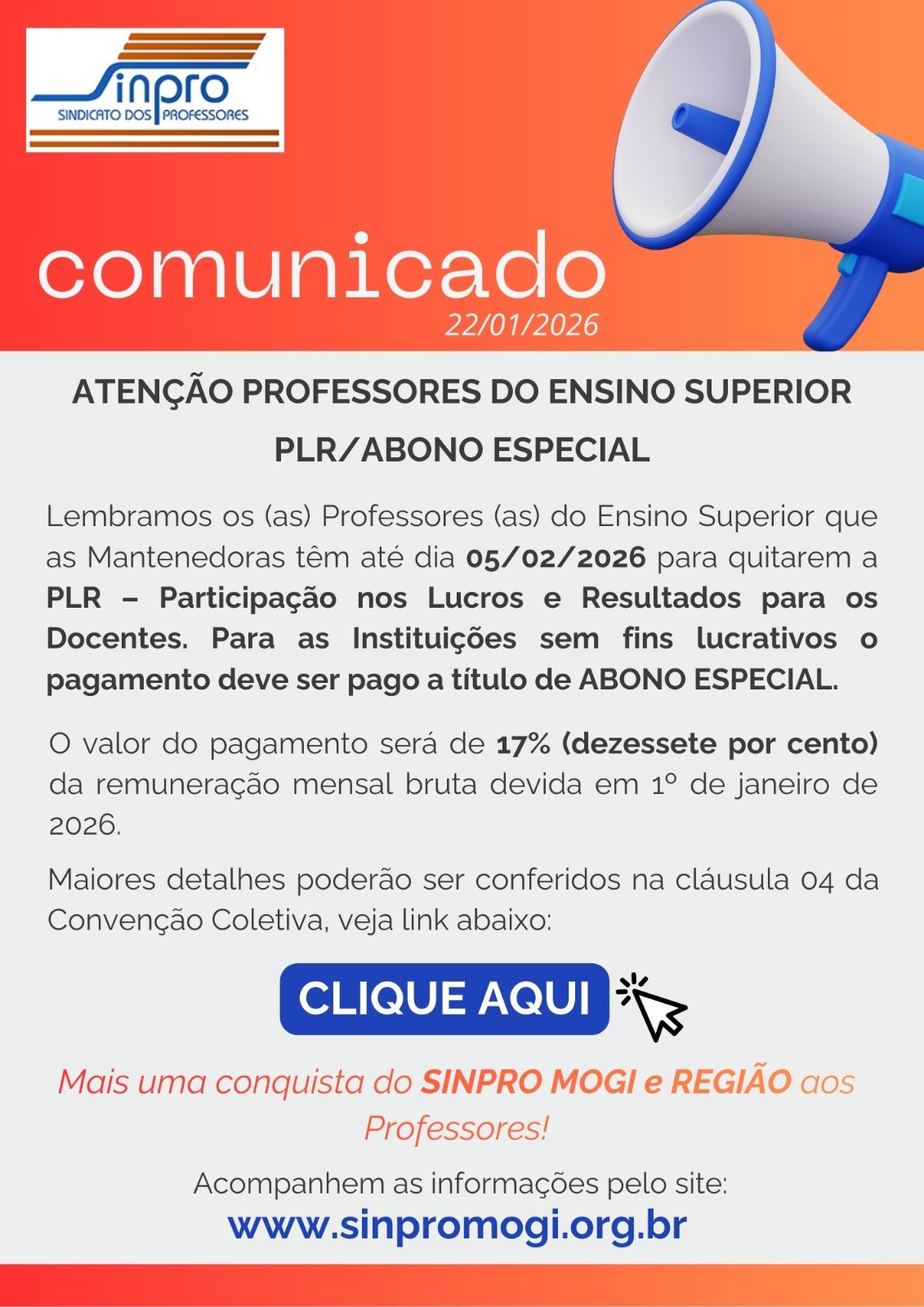 - 19/02/2026: Acordo sindical garante pagamento da PLR para centro Universitário Braz Cubas (Cruzeiro do Sul) Leia mais...