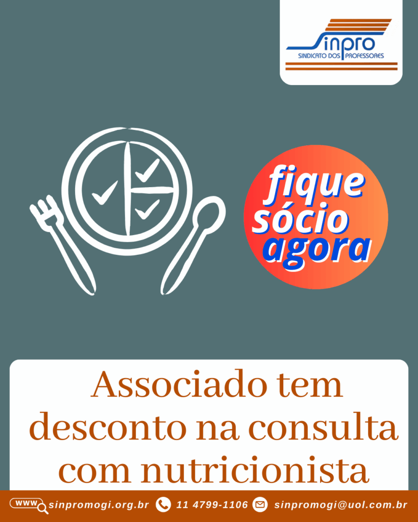 Dentre as vantagens listadas está clínica que presta atendimento nutricional e que possui tabela especial para sócios do Sinpro Mogi e Região.