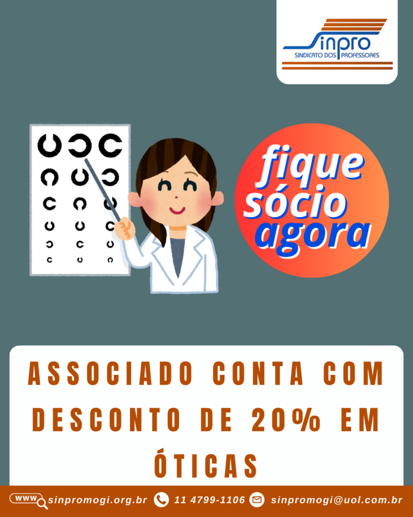 Dentre as vantagens listadas estão óticas que oferecem tabela especial com descontos de 20% para sócios do Sindicato dos Professores de Mogi das Cruzes e Região.Professor, fique sócio. Não fique só!Muitas das empresas que estimulam o trabalhador a não fazer parte do seu Sindicato, estão filiadas a uma entidade sindical para que ela as represente nas negociações coletivas.