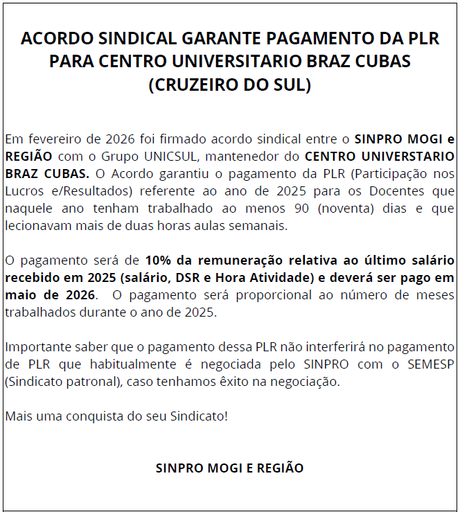 Acordo sindical garante pagamento da PLR para centro Universitário Braz Cubas (Cruzeiro do Sul)